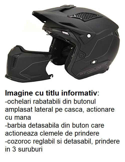 • casca se livreaza cu: 2 viziere secundare (ochelari soare integrati) – una transparenta si una neagra; cozoroc si masca (protectie) barbie detasabile;