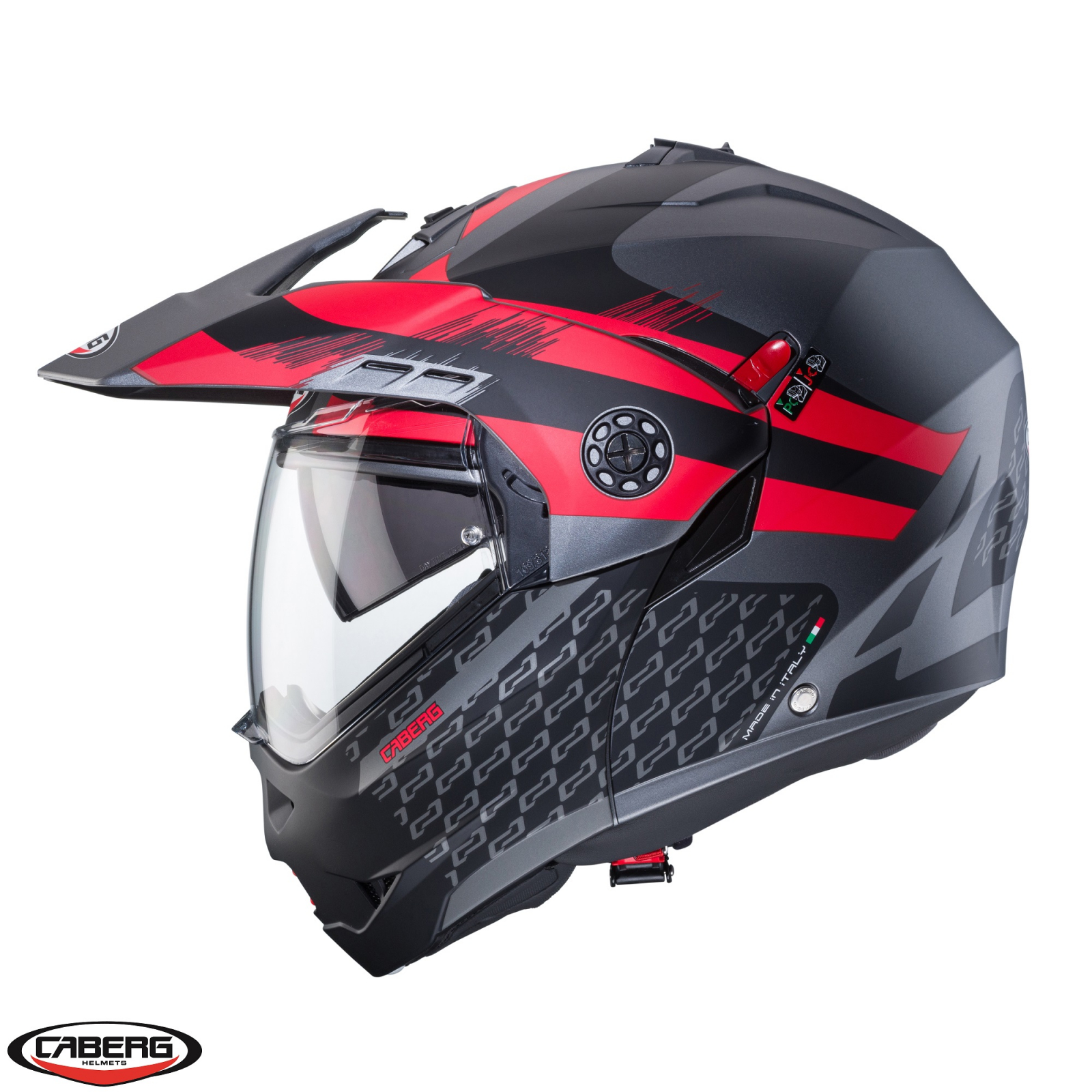 Casca modulabila (flip-up)/adventure Caberg model Tourmax X SV Sarabe L2 gun metal (titanium)/negru/rosu mat Pinlock ready – lentila Pinlock inclusa