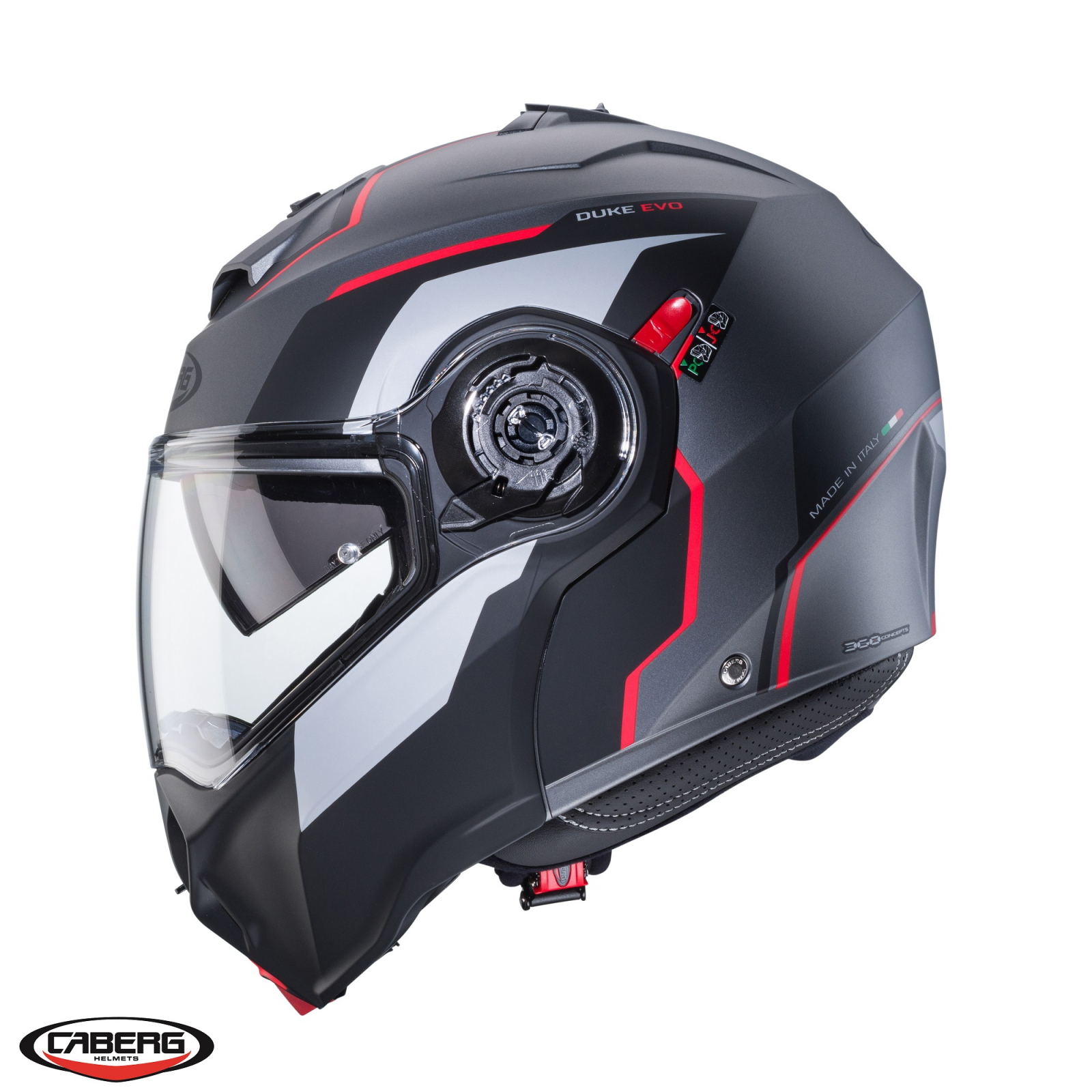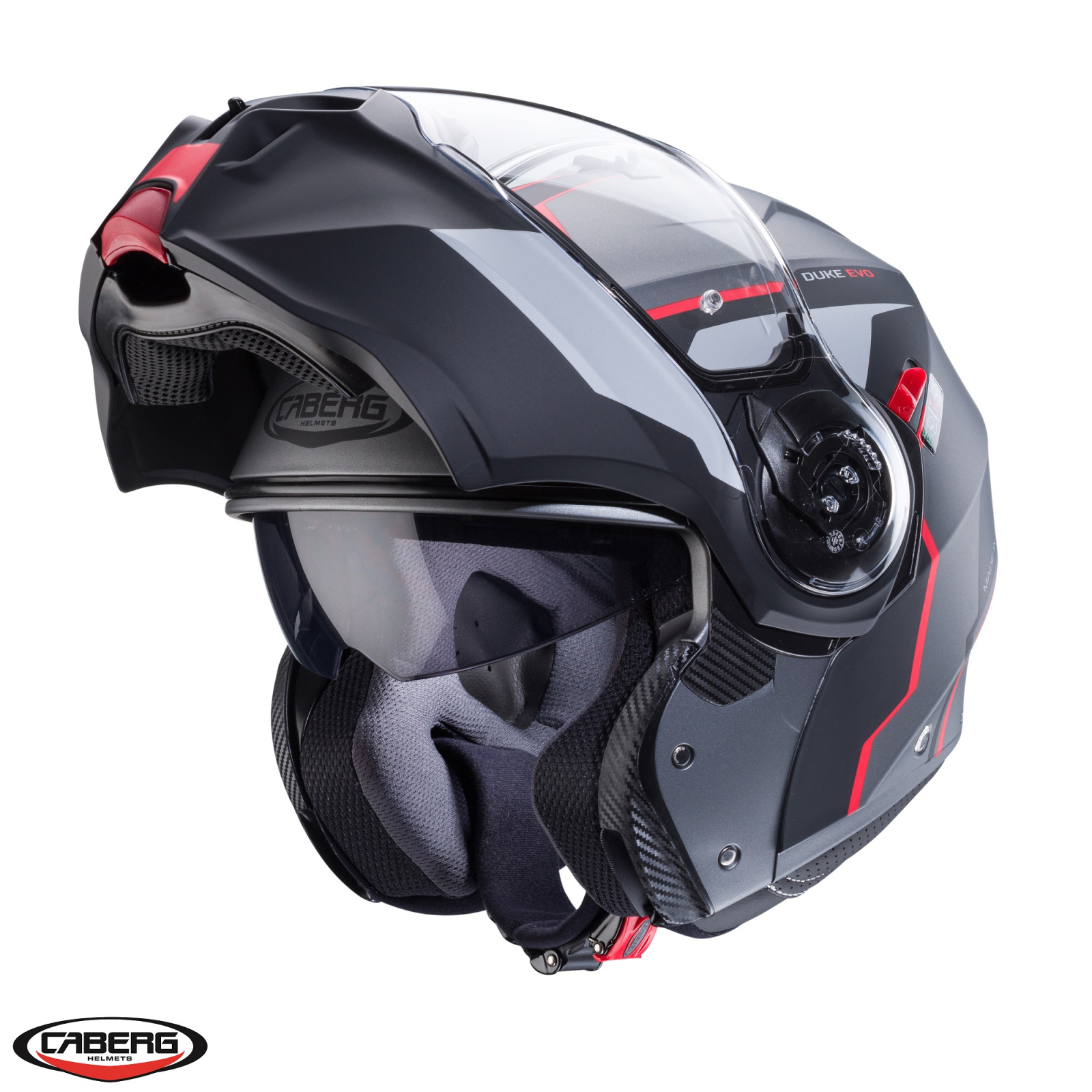 Casca modulabila (flip-up) Caberg model Duke Evo Move L2 SV gun metal (titanium)/negru/rosu mat Pinlock ready – lentila Pinlock inclusa