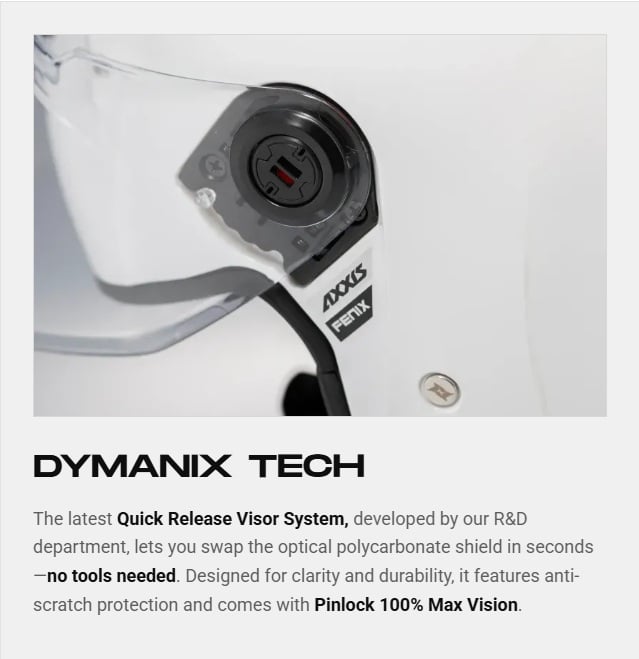 – DIYNAMIX TECH – cel mai recent sistem de demontare si montare al vizierei – Quick Release Visor System, dezvoltat de departamentul R&D, iti permite demontarea si montarea vizierei in doar cateva secunde. Conceput pentru durabilitate si usurinta in utilizare, viziera este anti zgarieturi (anti-scratch) si permite montarea unei lentile antiaburire Pinlock 100% Max Vision (lentila se achizitioneaza separat);